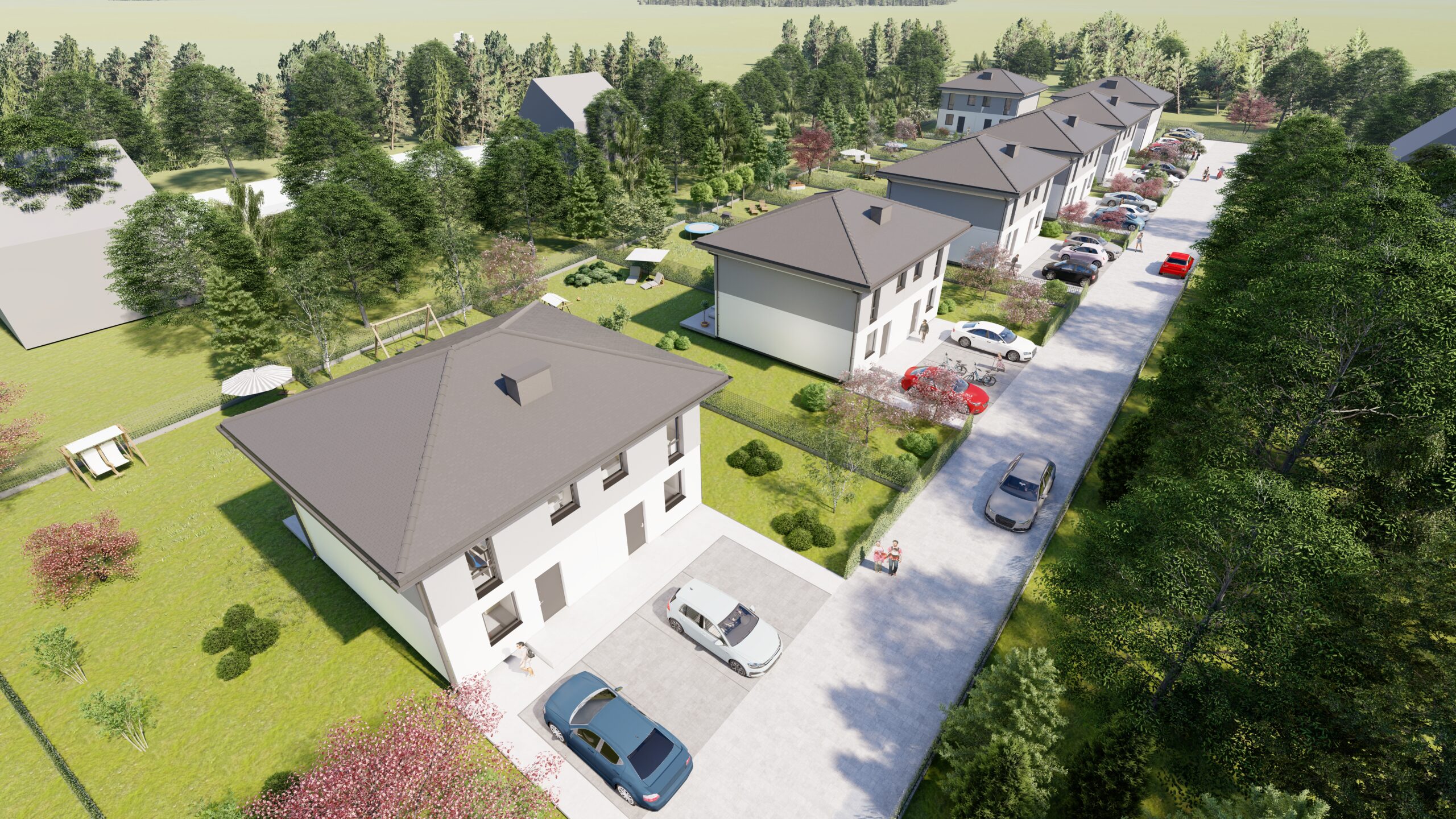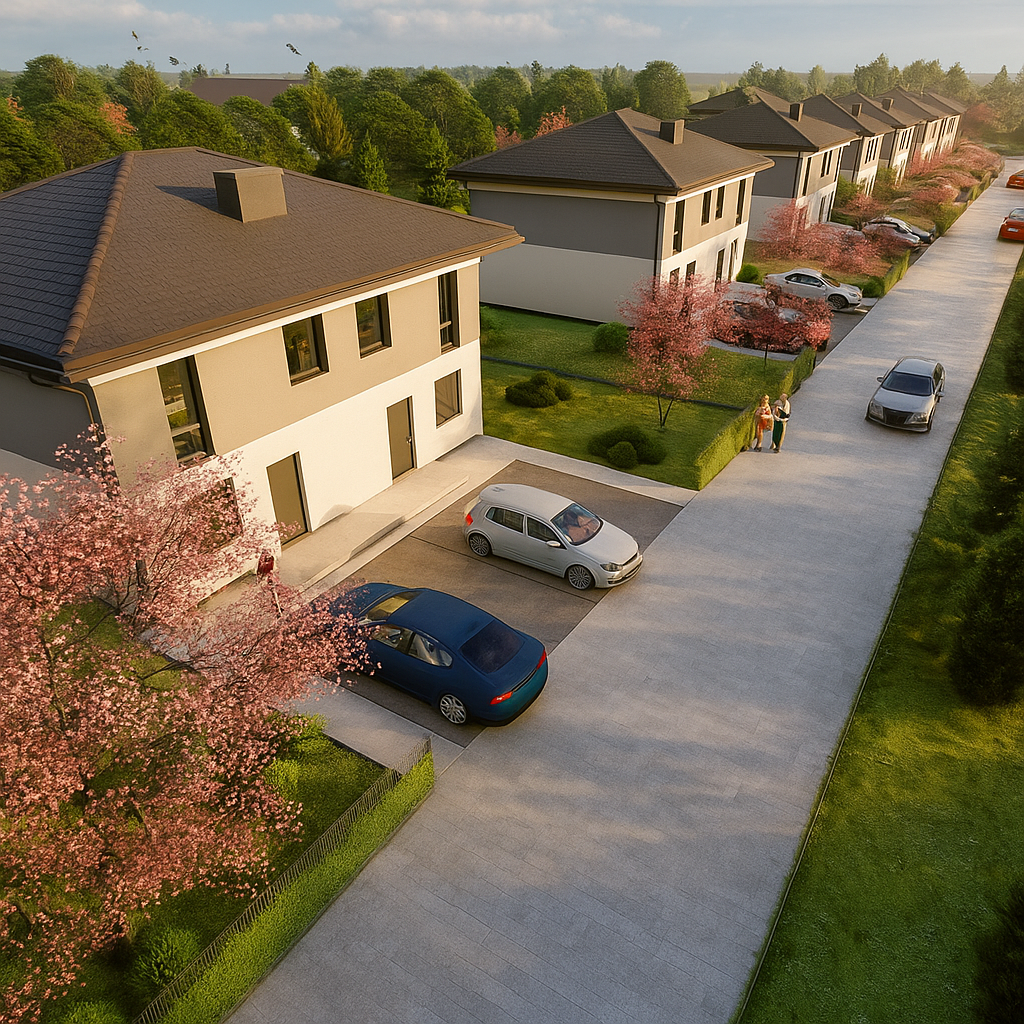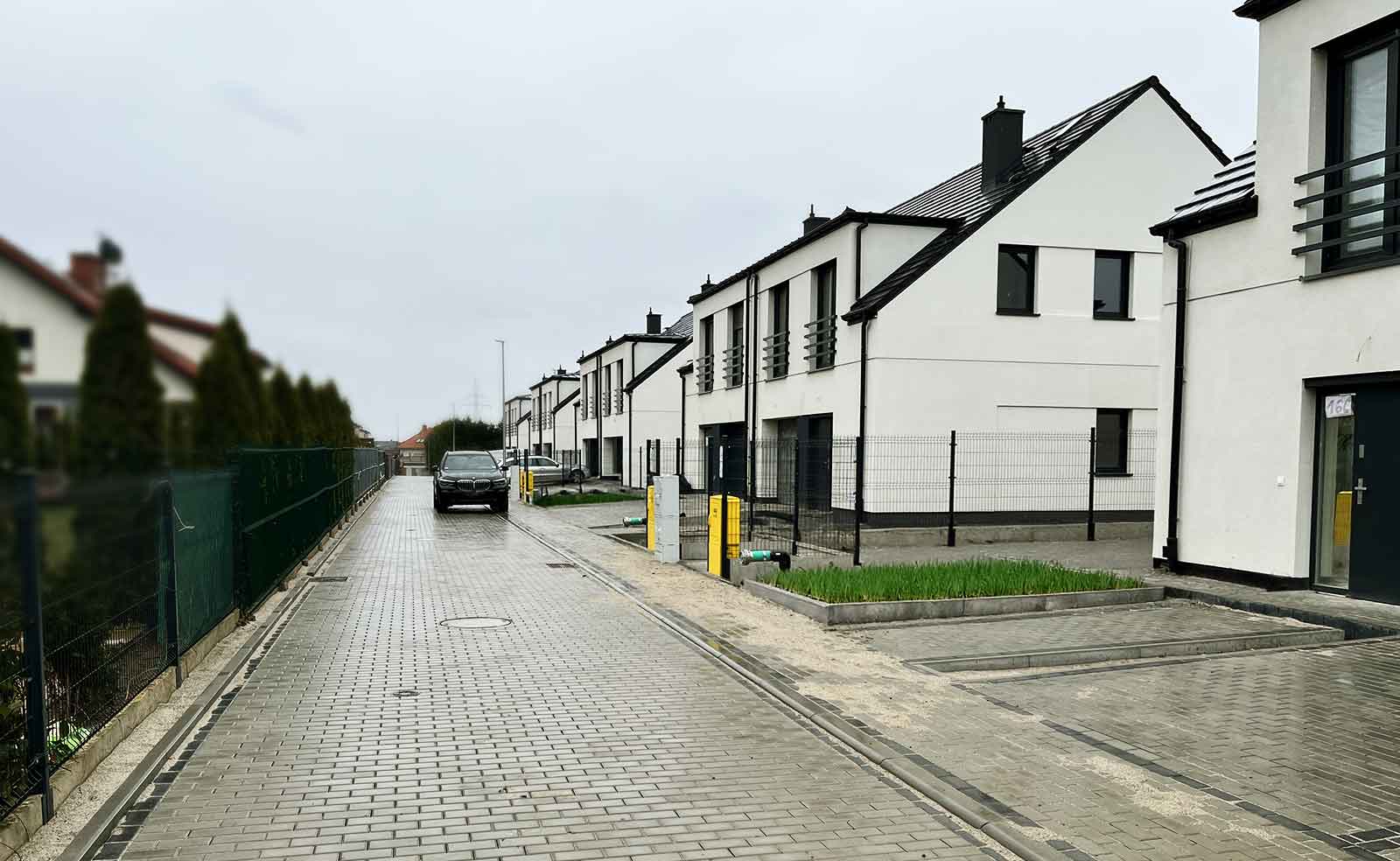 Do każdego domu prowadzi utwardzona droga dojazdowa, zapewniająca wygodny i bezpieczny dostęp niezależnie od pogody.